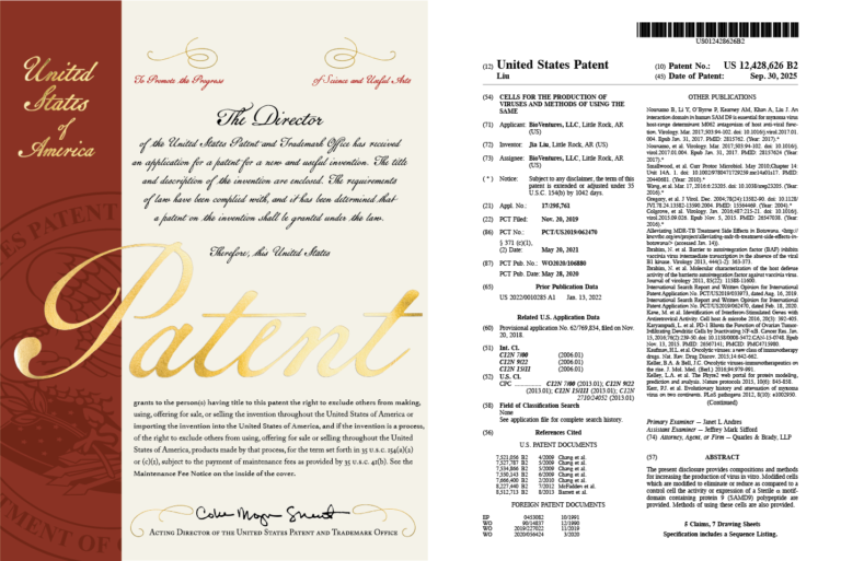 What’s the problem? Viruses are essential tools in modern biotechnology, with applications in cancer immunotherapy, gene therapy, and vaccine development. However, producing viruses efficiently at clinical and commercial scale remains a major bottleneck. Many commonly used human cell lines, including the widely adopted A549 line, retain natural antiviral defense mechanisms that limit viral replication, resulting in lower yields and increased manufacturing costs. One key antiviral factor is the human protein SAMD9, which restricts viral replication inside host cells. Its presence significantly reduces the efficiency of producing certain therapeutic viruses, including oncolytic viruses such as myxoma virus. This limitation slows research, clinical development, and commercialization of promising viral therapies. What does this technology do? This patent covers engineered human cell lines modified to eliminate or reduce expression of the antiviral host factor SAMD9, enabling significantly enhanced viral replication in vitro. By removing this natural antiviral restriction, the modified cells allow viruses to replicate more efficiently, increasing overall production yields. The technology can be implemented using gene-editing approaches such as CRISPR-Cas9 to generate stable, virus-permissive cell lines suitable for research, clinical development, and manufacturing. These engineered cells have demonstrated improved production of oncolytic viruses, which are increasingly used as targeted cancer therapeutics and immunotherapies. By improving viral replication efficiency, this innovation has the potential to: This platform provides a practical and scalable solution for enhancing viral production using human cell lines compatible with therapeutic applications. Inventor Jia Liu, PhD, Associate Professor in the Department of Microbiology and Immunology at University of Arkansas for Medical Sciences (UAMS).
